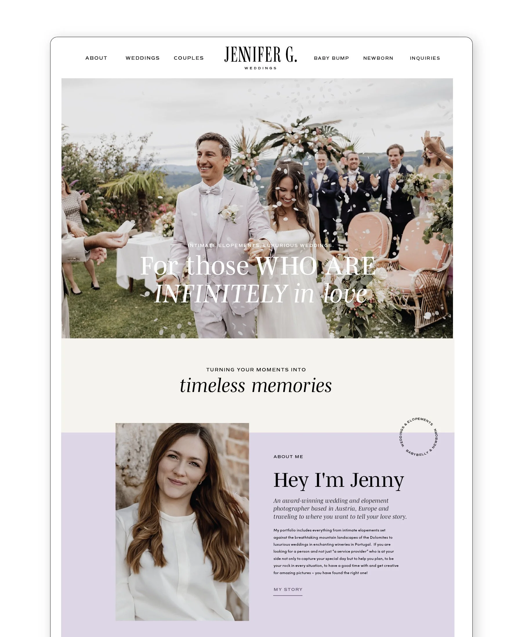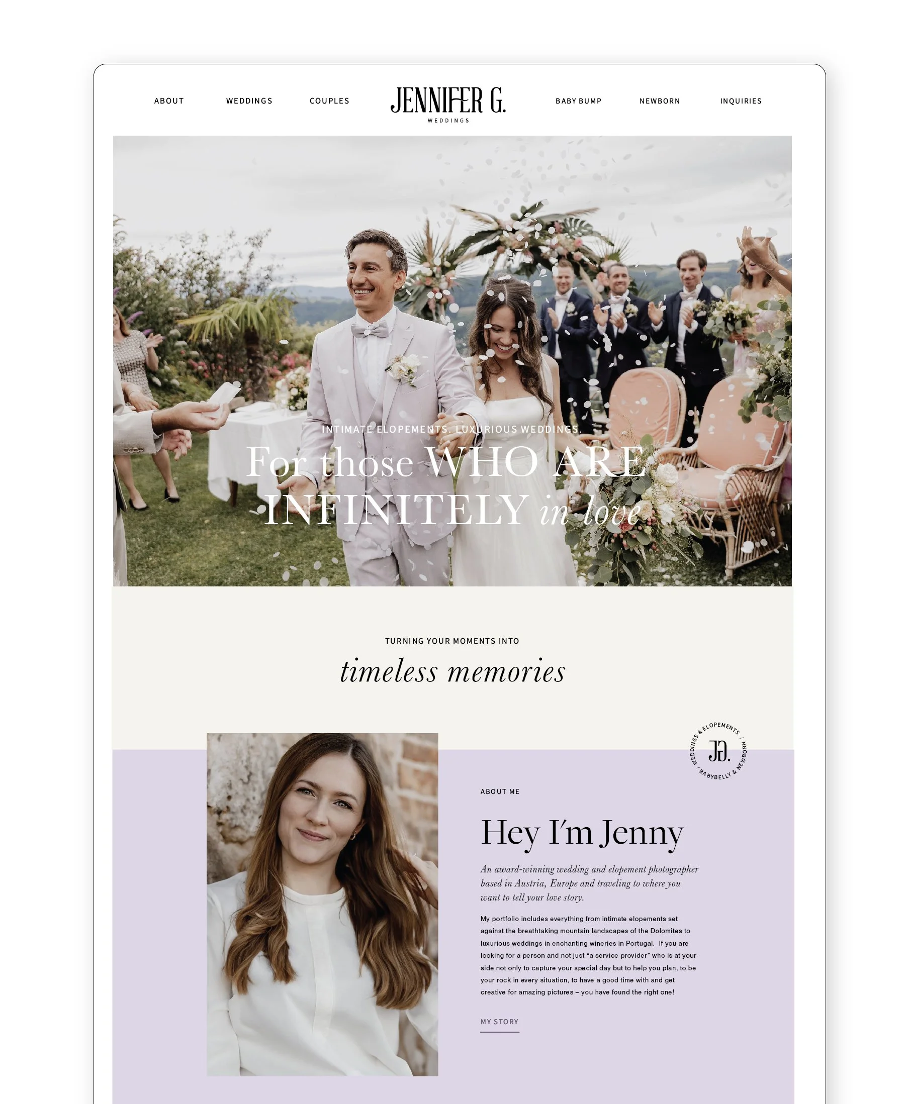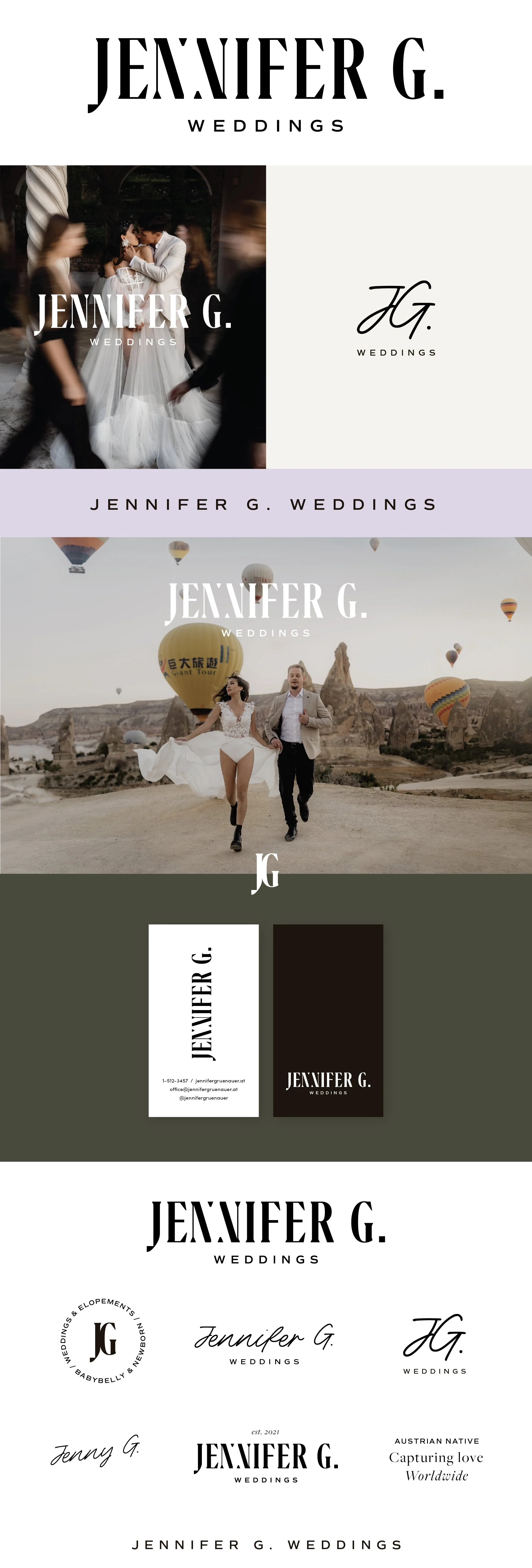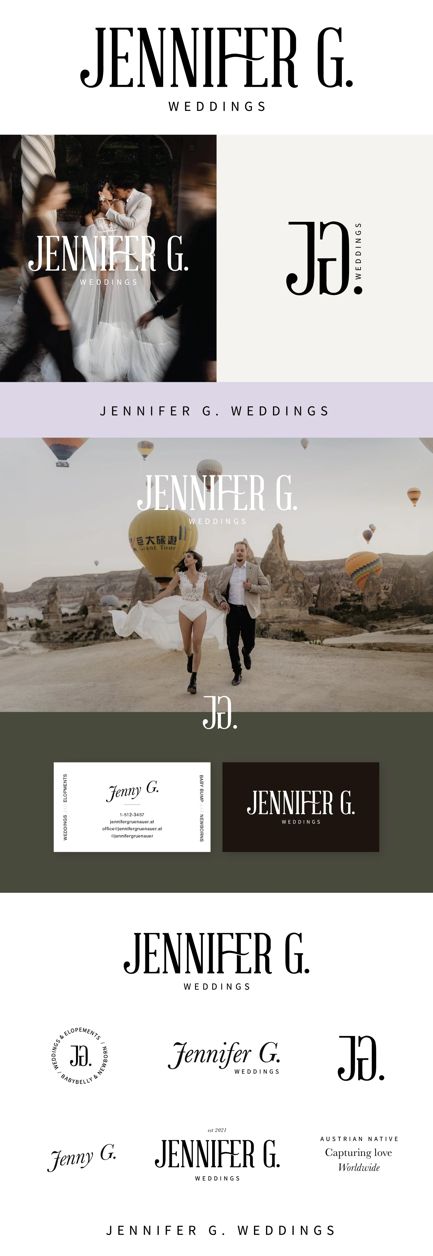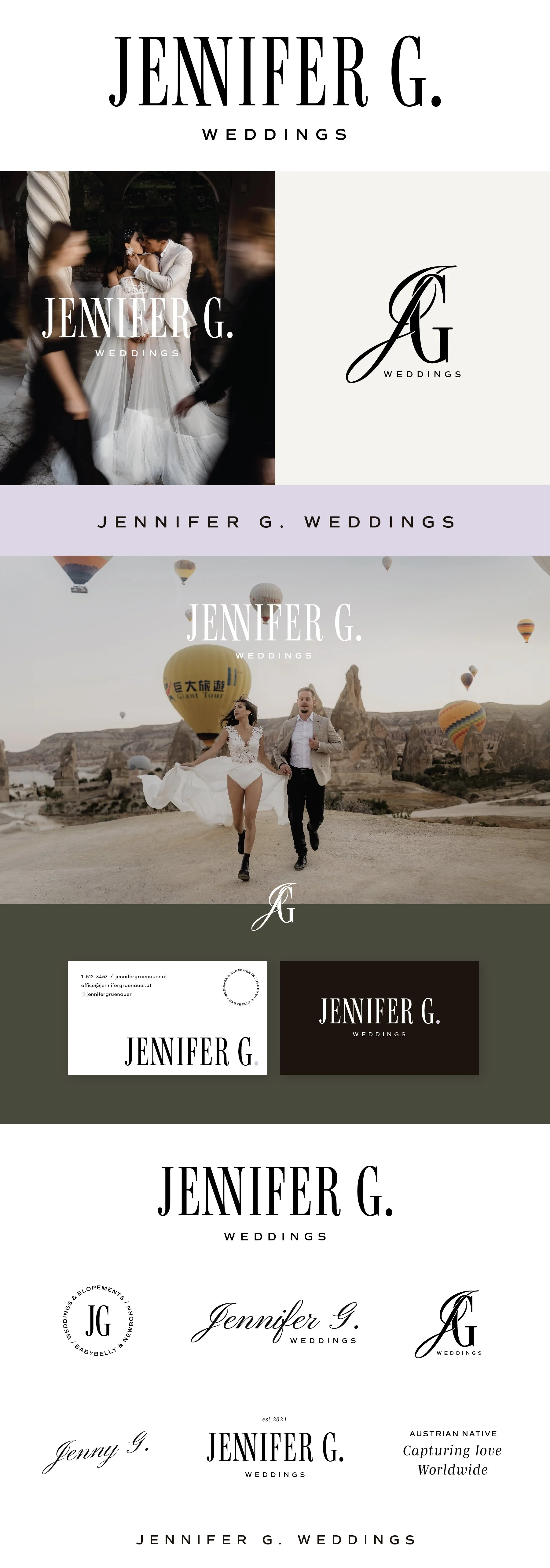 Jennifer G. Weddings is a wedding + elopement photographer and maternity + newborn photographer based in Austria. Her rebrand was prompted by a goal to have her logo and website match a higher caliber and price point of her clientele.