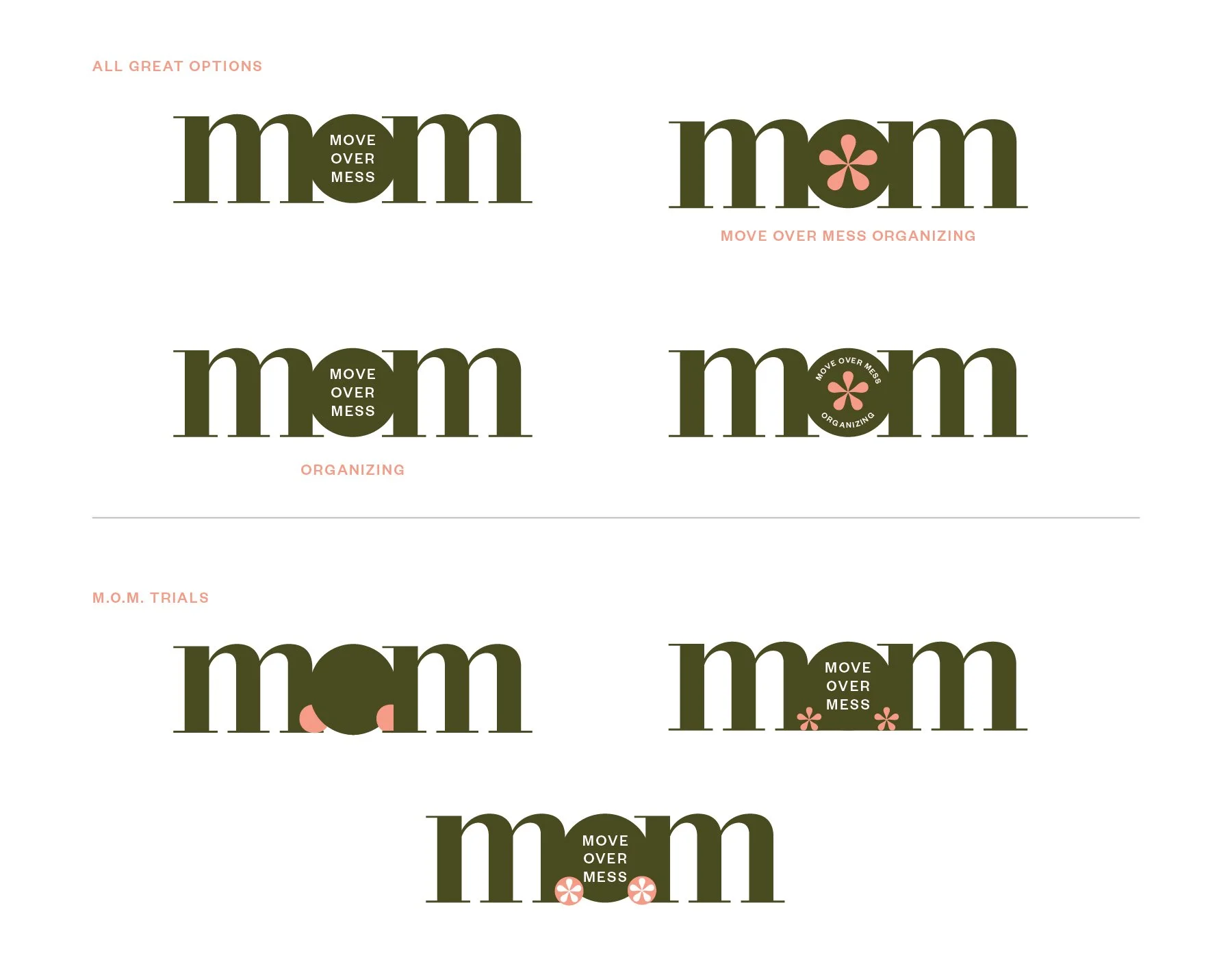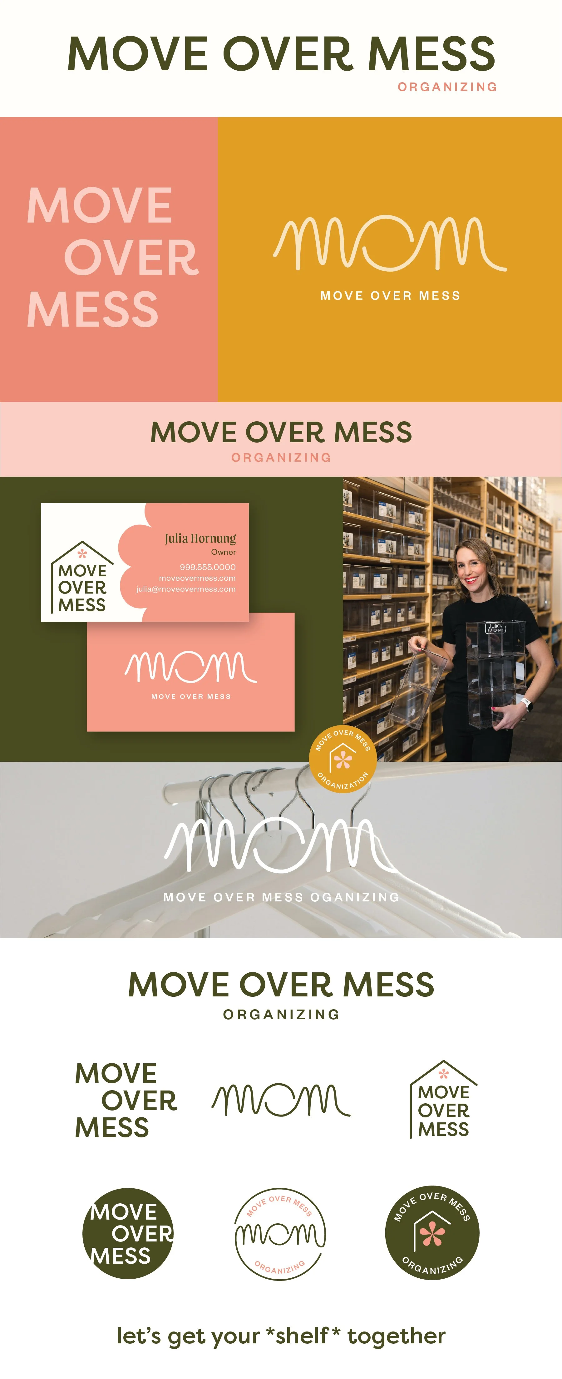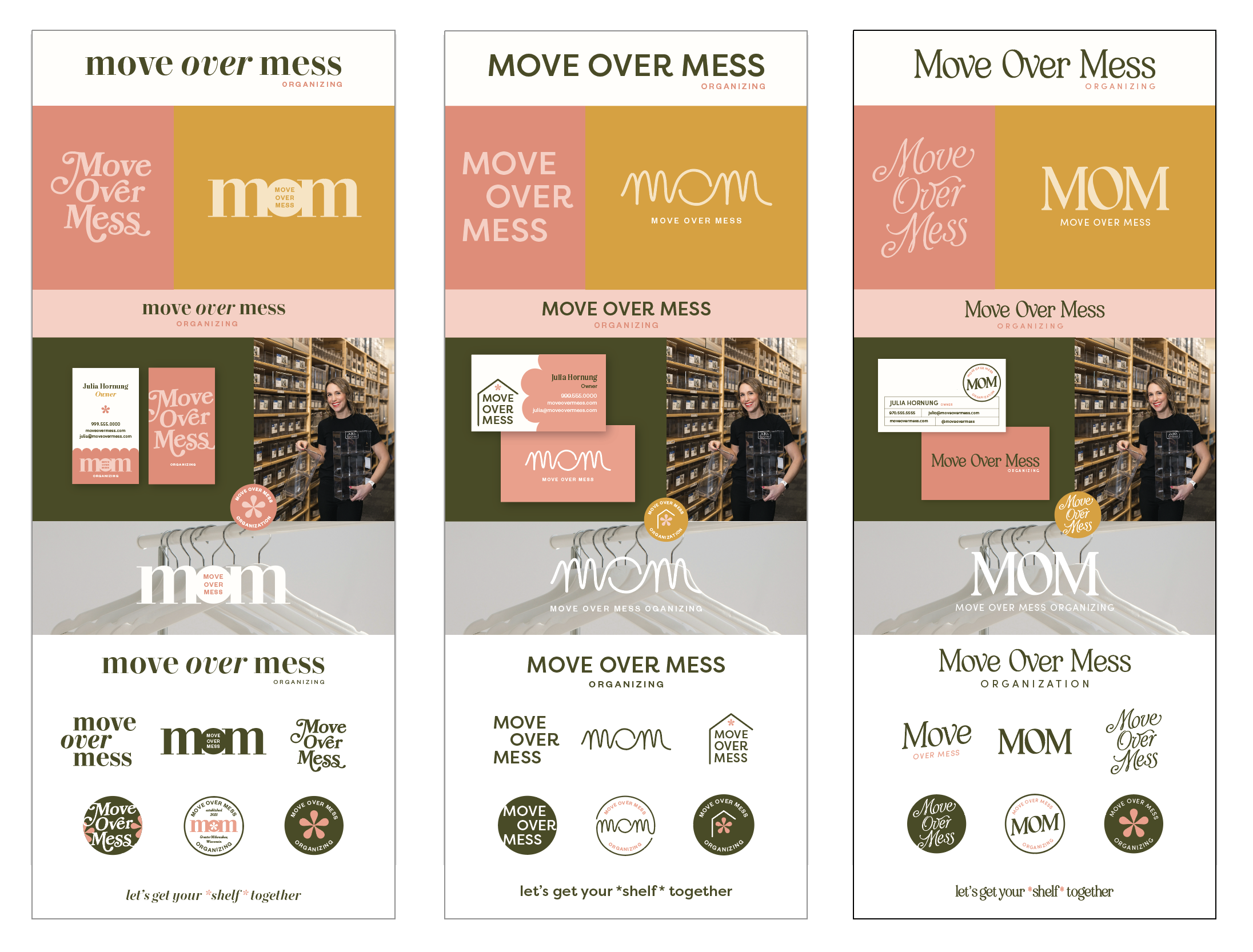 This concept feels modern and energetic but maintains a warm, inviting personality. I like the subtle motion and energy of having “Over” italicized. All of those elements are reinforced in the stacked, playful vertical version. The ornamental parts of the letters all feel very intentional and create a distinct text mark that I think would be great on shirts or totes for your team. I could see this being on the back of the t-shirts and being a really fun playful part of your branding and a bright first impression for clients when you arrive to their home. The MOM mark is also a strong, bold mark that will be versatile and easy to use. It canbe used with or without “Move Over Mess” in the “o”. EAch of the letters can also be a different color when you want extra pops of color.
