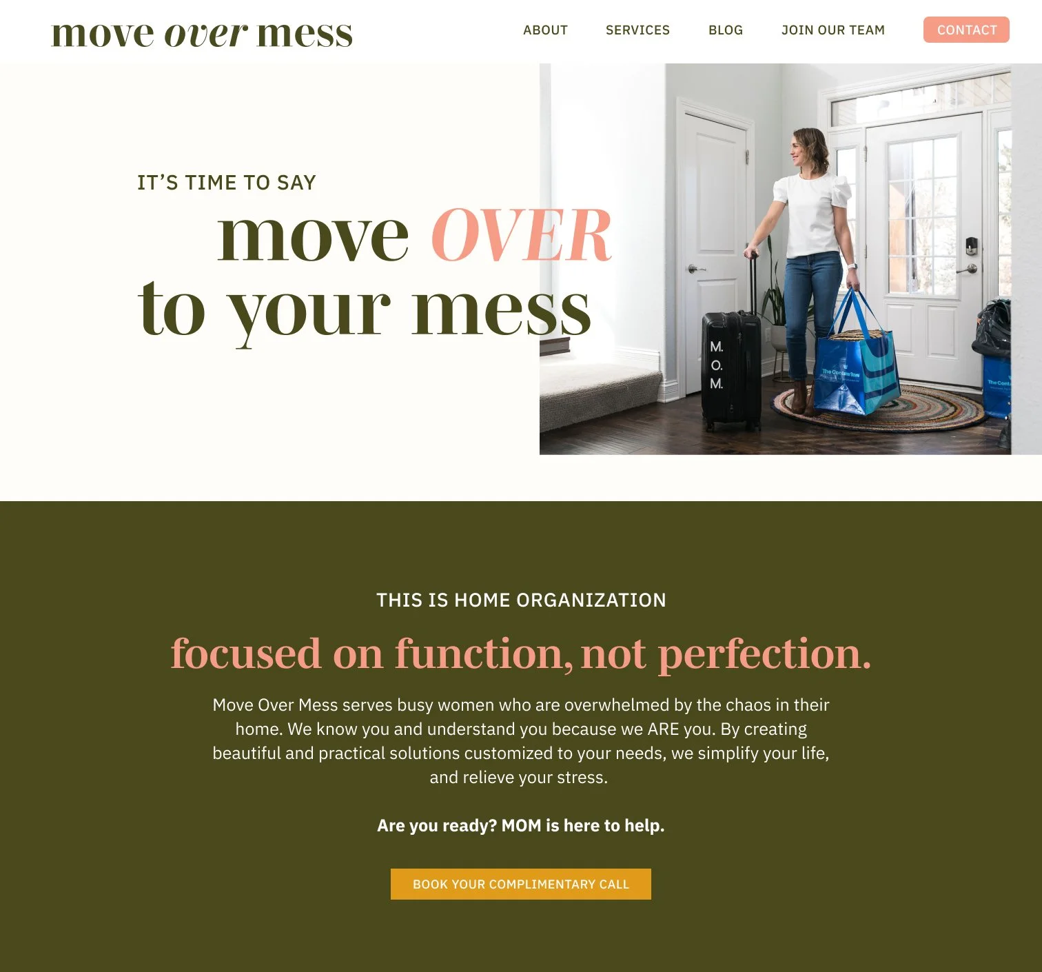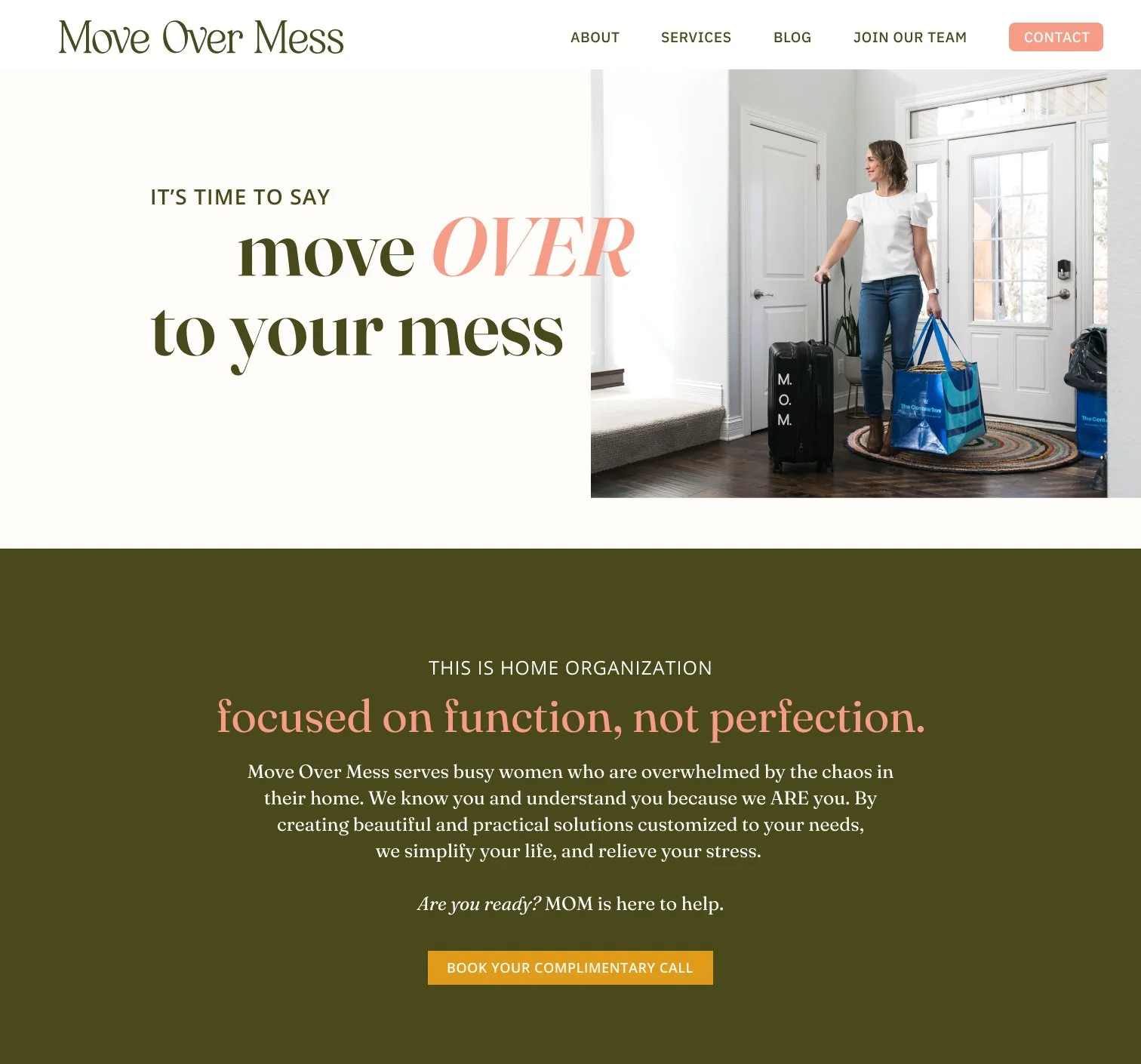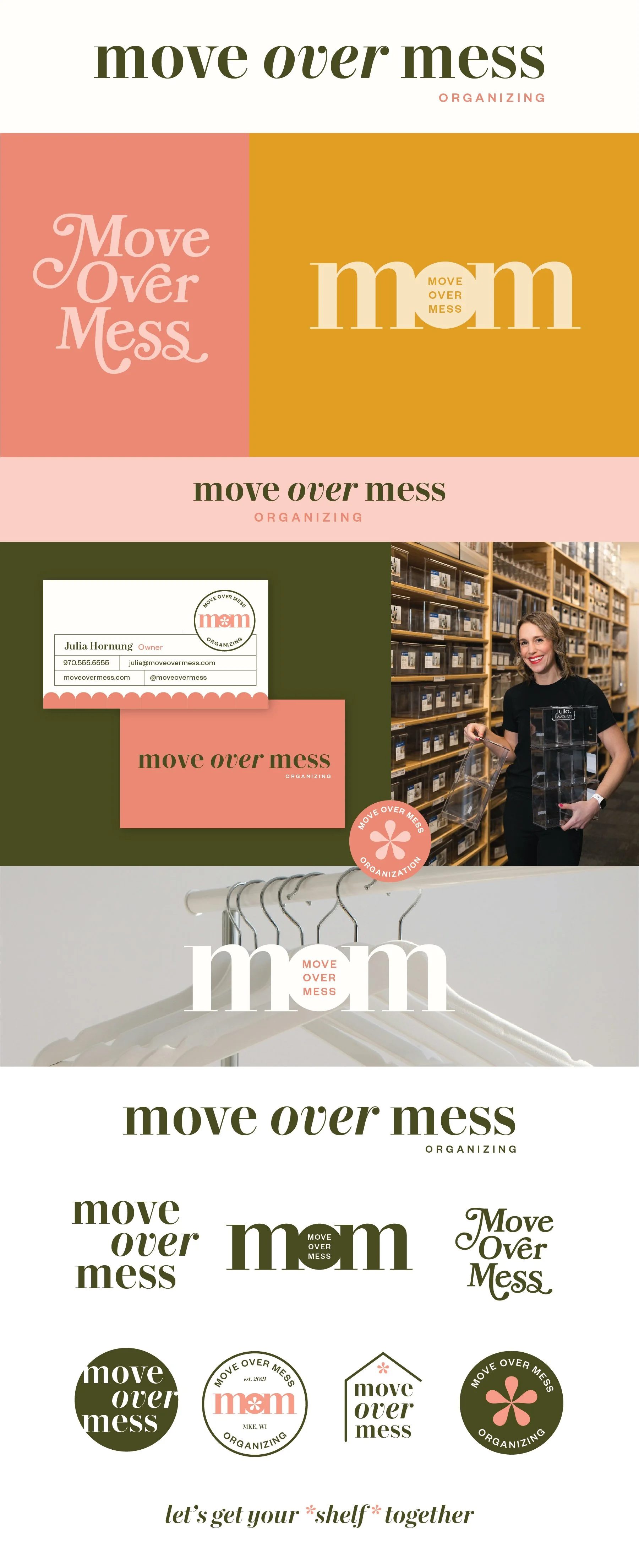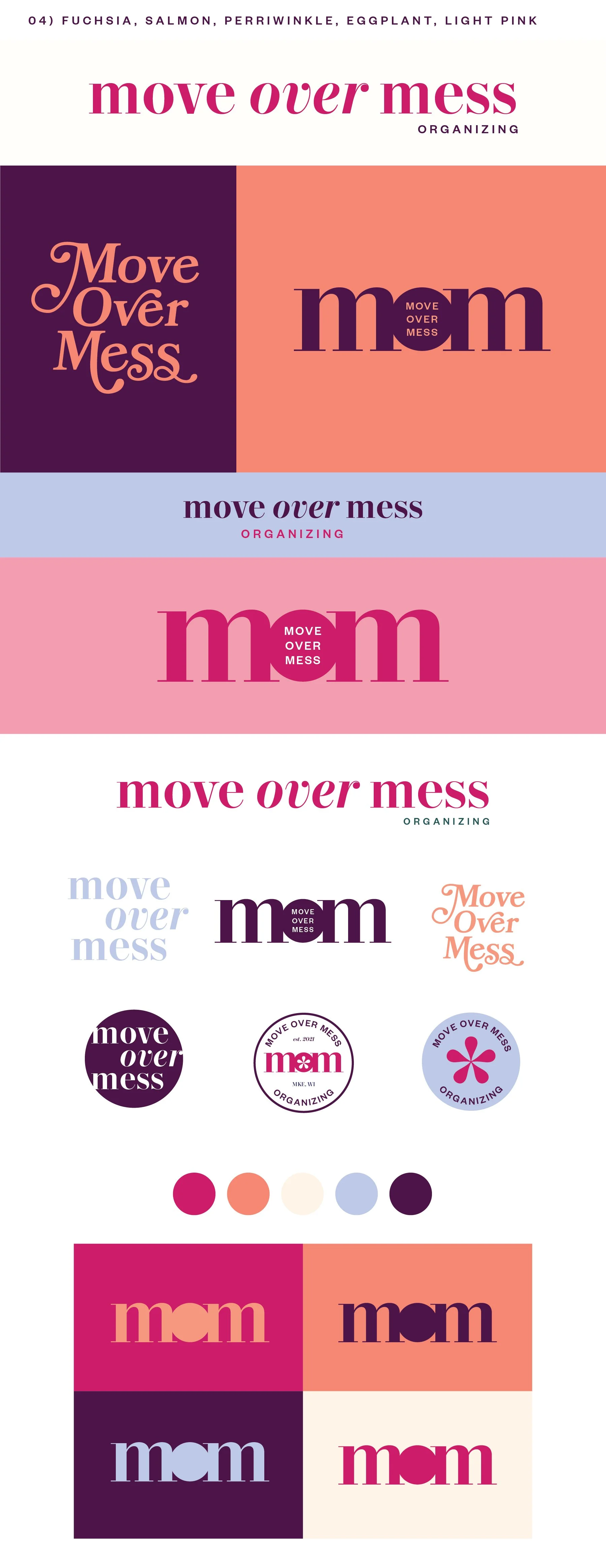 This concept feels modern and energetic but maintains a warm, inviting personality. I like the subtle motion and energy of having “Over” italicized. All of those elements are reinforced in the stacked, playful vertical version. The ornamental parts of the letters all feel very intentional and create a distinct text mark that I think would be great on shirts or totes for your team. I could see this being on the back of the t-shirts and being a really fun playful part of your branding and a bright first impression for clients when you arrive to their home. The MOM mark is also a strong, bold mark that will be versatile and easy to use. It canbe used with or without “Move Over Mess” in the “o”. EAch of the letters can also be a different color when you want extra pops of color.