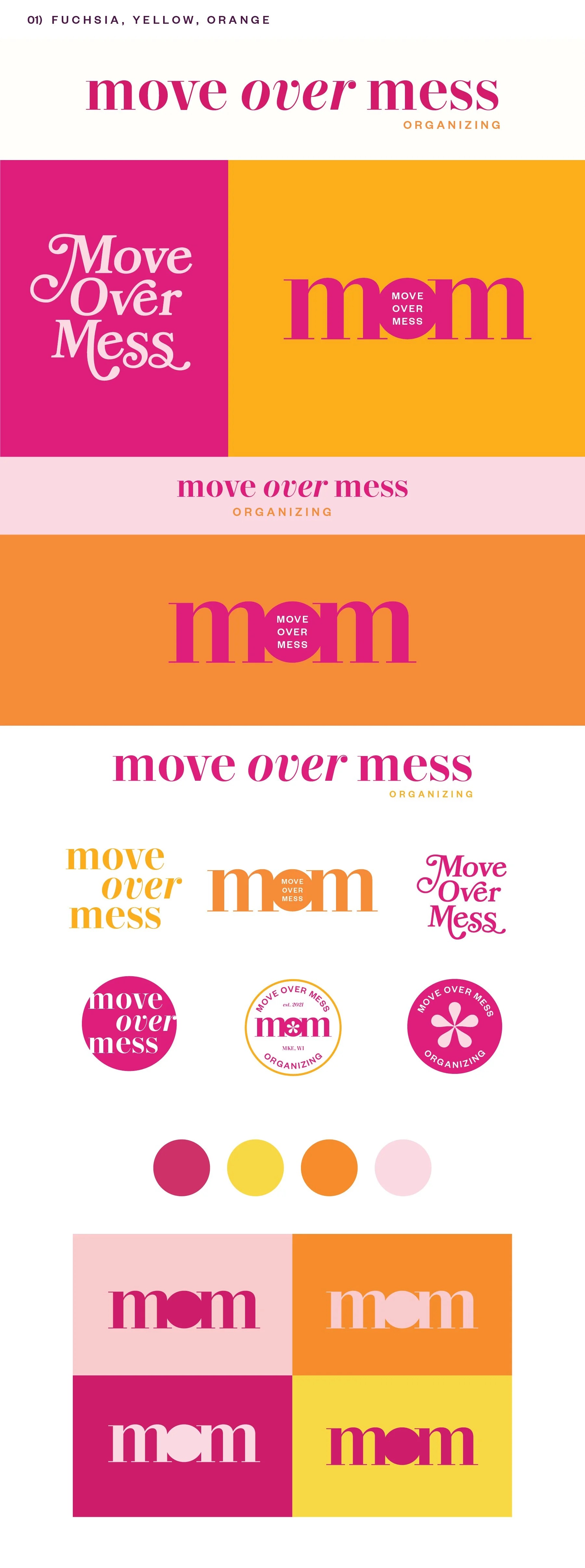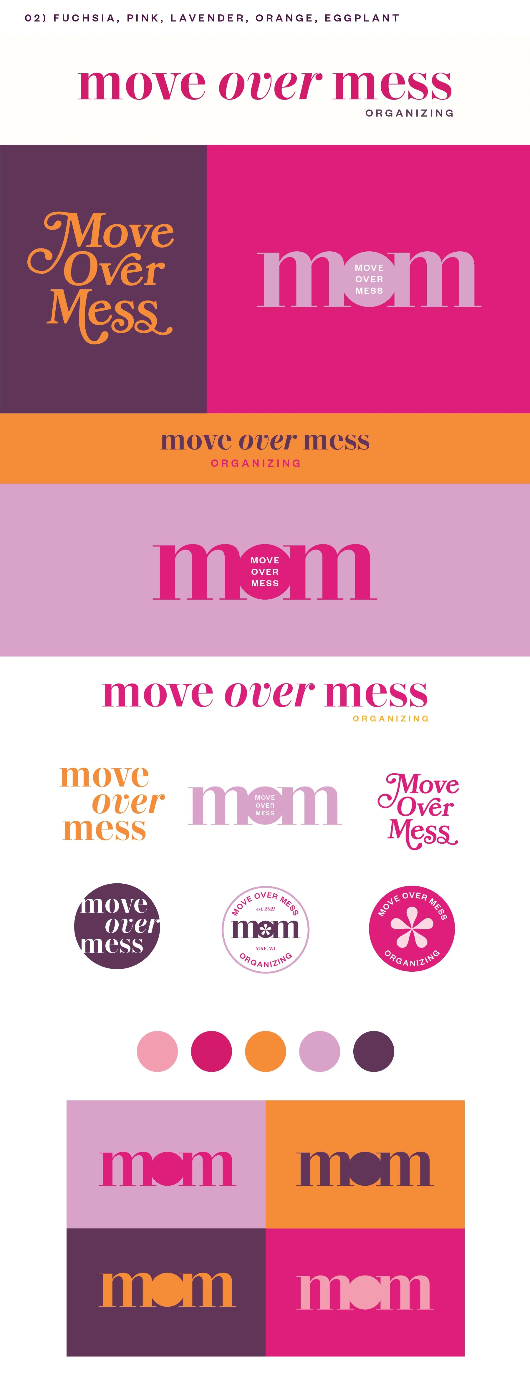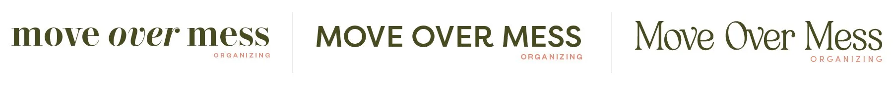 This concept feels modern and energetic but maintains a warm, inviting personality. I like the subtle motion and energy of having “Over” italicized. All of those elements are reinforced in the stacked, playful vertical version. The ornamental parts of the letters all feel very intentional and create a distinct text mark that I think would be great on shirts or totes for your team. I could see this being on the back of the t-shirts and being a really fun playful part of your branding and a bright first impression for clients when you arrive to their home. The MOM mark is also a strong, bold mark that will be versatile and easy to use. It canbe used with or without “Move Over Mess” in the “o”. EAch of the letters can also be a different color when you want extra pops of color.