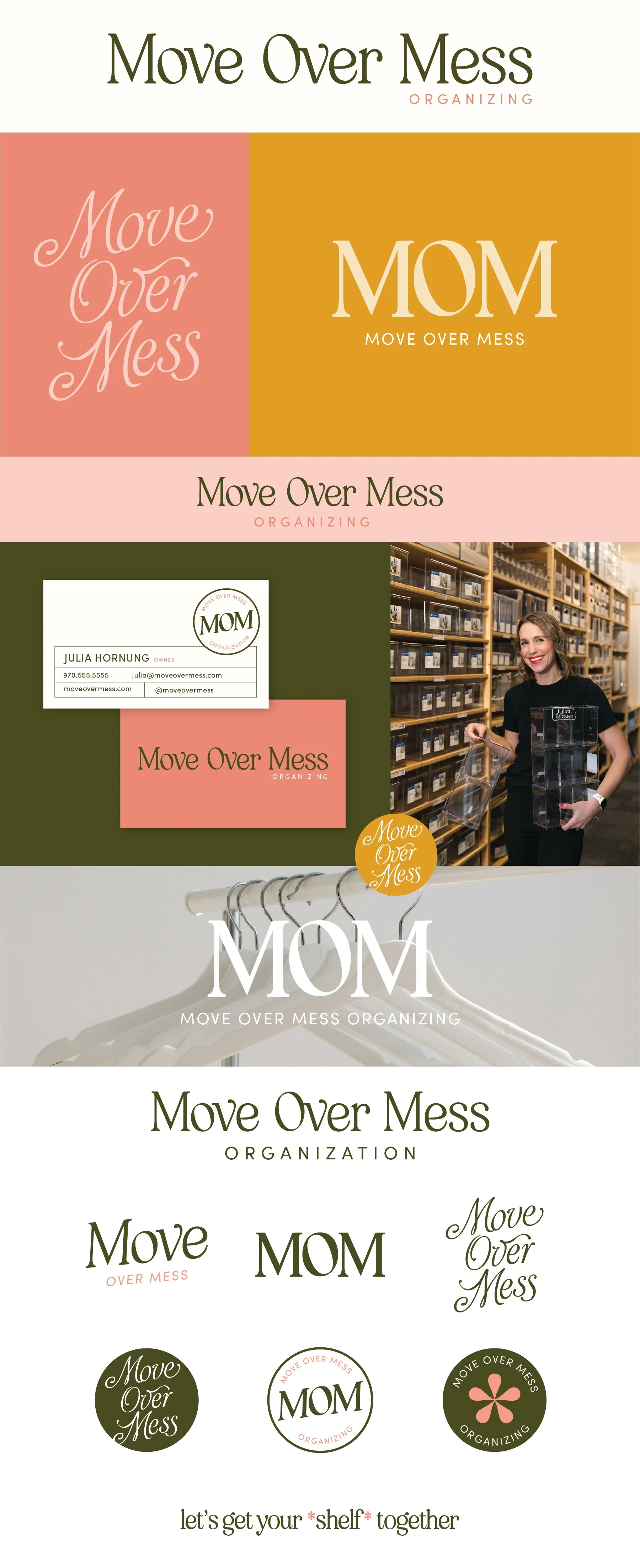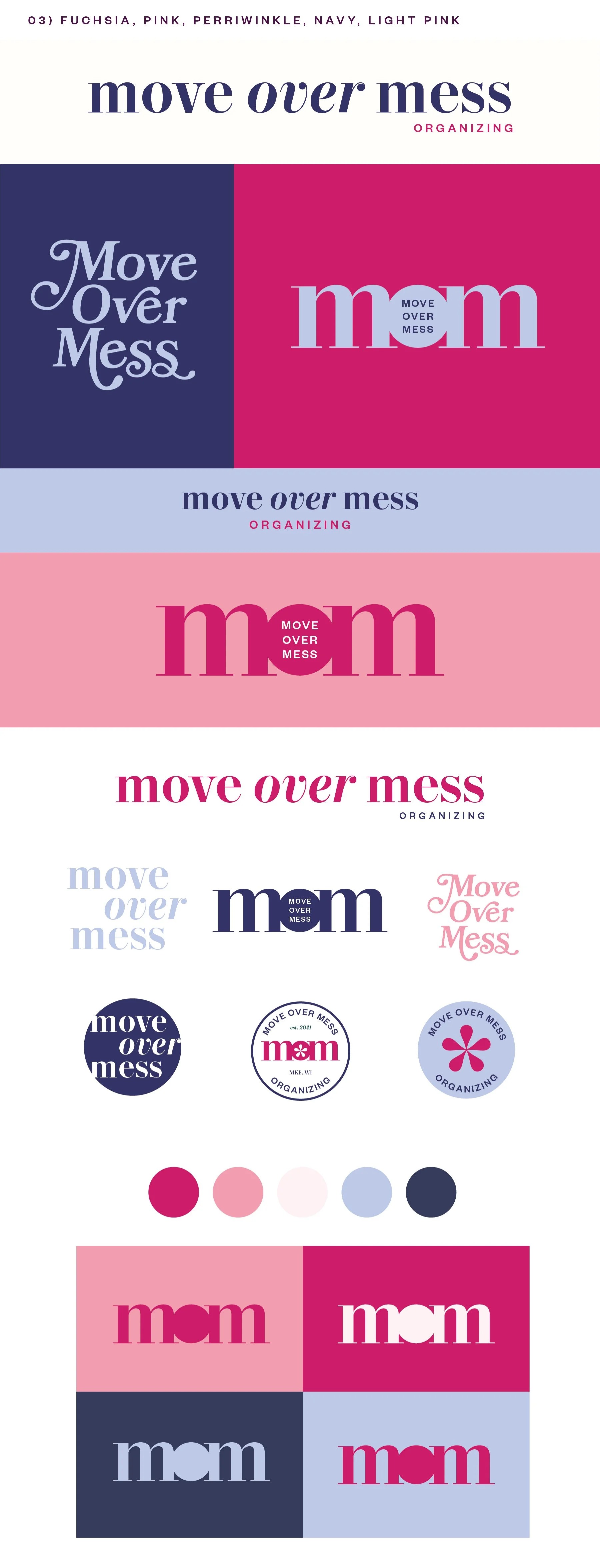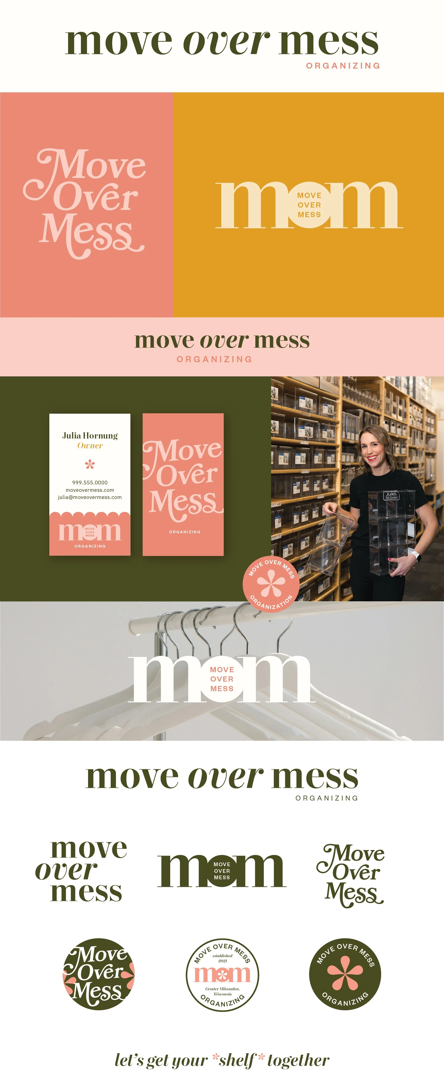 This concept feels modern and energetic but maintains a warm, inviting personality. I like the subtle motion and energy of having “Over” italicized. All of those elements are reinforced in the stacked, playful vertical version. The ornamental parts of the letters all feel very intentional and create a distinct text mark that I think would be great on shirts or totes for your team. I could see this being on the back of the t-shirts and being a really fun playful part of your branding and a bright first impression for clients when you arrive to their home. The MOM mark is also a strong, bold mark that will be versatile and easy to use. It canbe used with or without “Move Over Mess” in the “o”. EAch of the letters can also be a different color when you want extra pops of color.