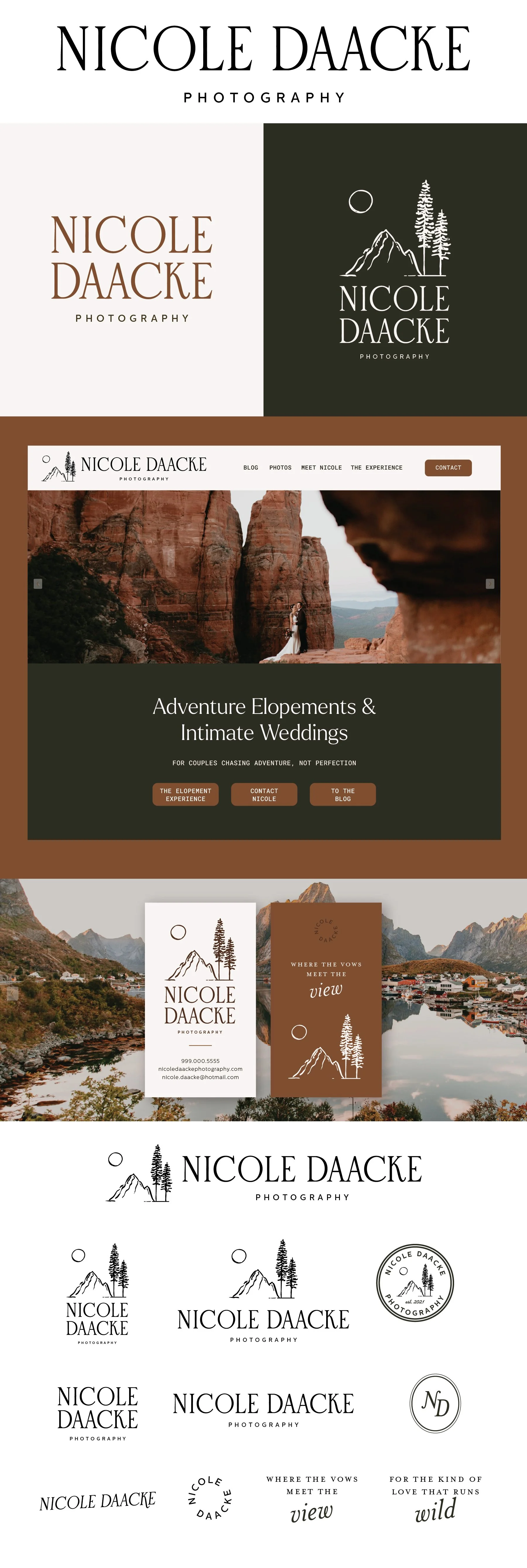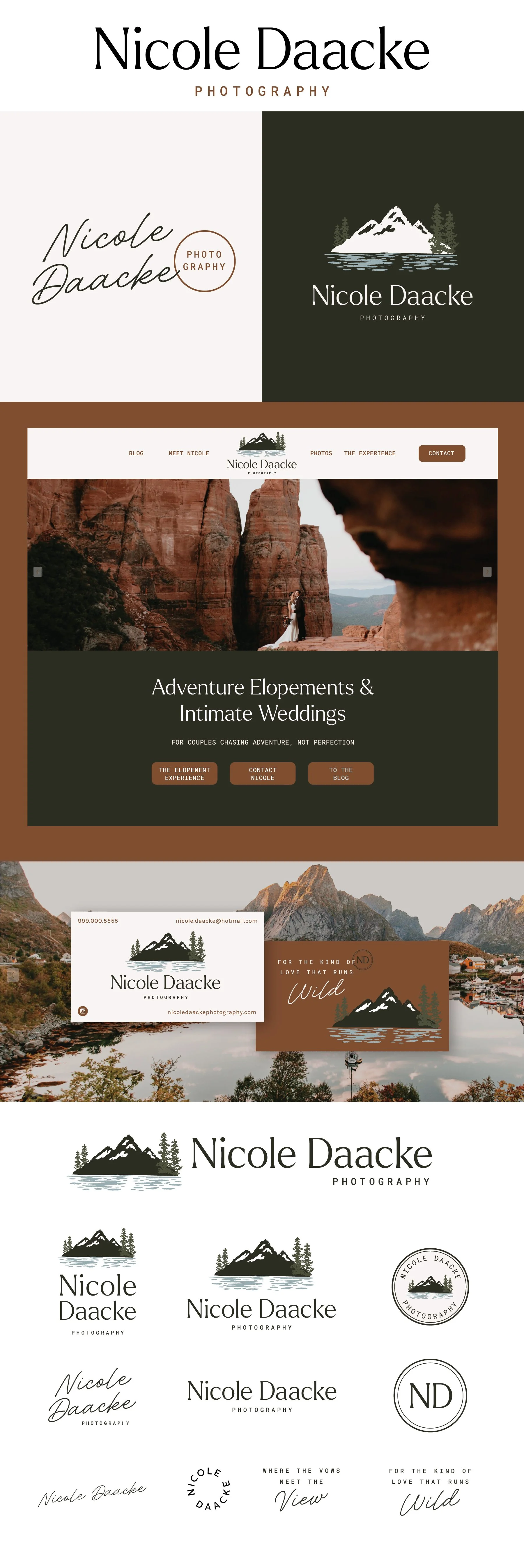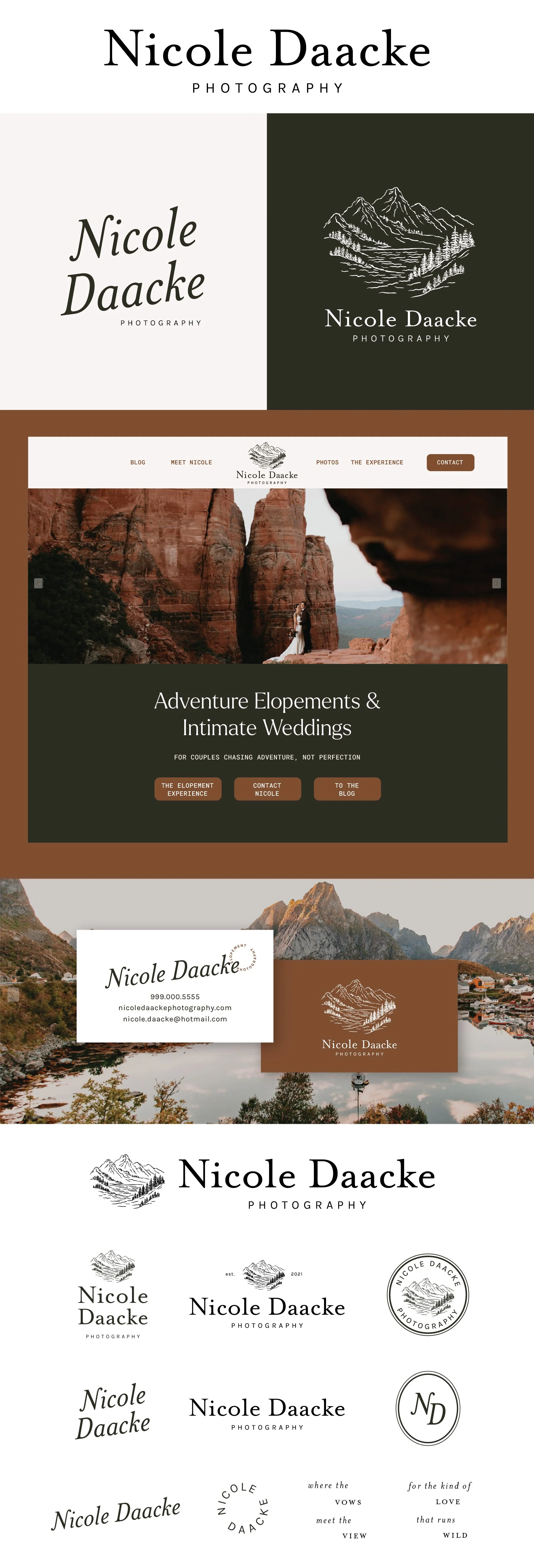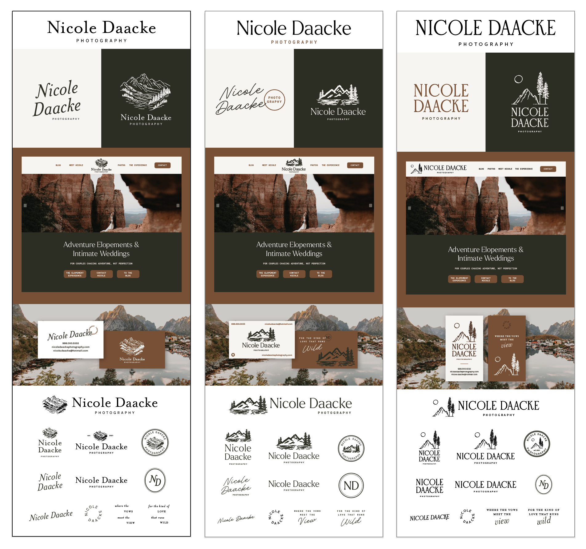 Business card concepts and the homepage mockup are meant to show how the brand can progress beyond the logo alone and will be refined along with the logo. Additionally, the information shown is placeholder information.